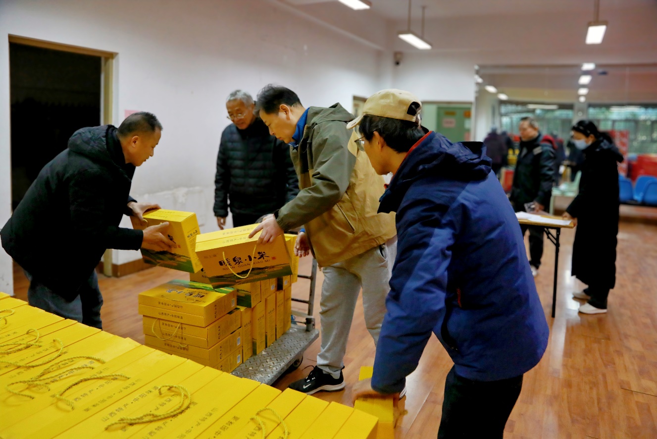 岁末年初之际,离退休各党支部(管理小组)的委员们早早汇聚于此,领取离退休工作处采购自学校对口扶贫地区山西中阳县的小米、木耳等农特产慰问品。