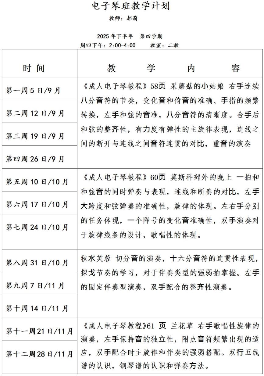 本课程以电子琴演奏技法为核心,系统训练学员的双手协调性、节奏把控与音乐表现力。通过《采蘑菇的小姑娘》《莫斯科郊外的晚上》等经典曲目,强化手指灵活度与节奏稳定性。注重旋律的歌唱性处理,学习连奏与断奏的对比、重音表现、强弱拍控制等音乐表现手法,使演奏更具感染力。每节课聚焦一首乐曲的演奏技巧与音乐处理,适合成人学员循序渐进提升电子琴演奏水平,培养对音乐风格的敏锐感知与表现力。