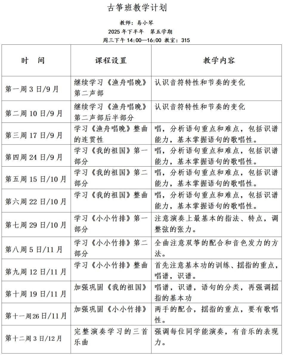 本课程以古筝经典曲目《渔舟唱晚》《我的祖国》《小小竹排》为核心,由浅入深、循序渐进,系统提升演奏技巧与音乐表现力。课程设计从识谱、唱谱到指法运用,逐步掌握摇指、双筝配合等核心技巧,强化节奏感与音准,夯实演奏基础。课程从单曲精练到完整演绎,适合不同水平的学员系统提升。无论是基本功强化,还是音乐表现力的培养,本课程都将帮助学员在传统筝乐中展现个人艺术风采。