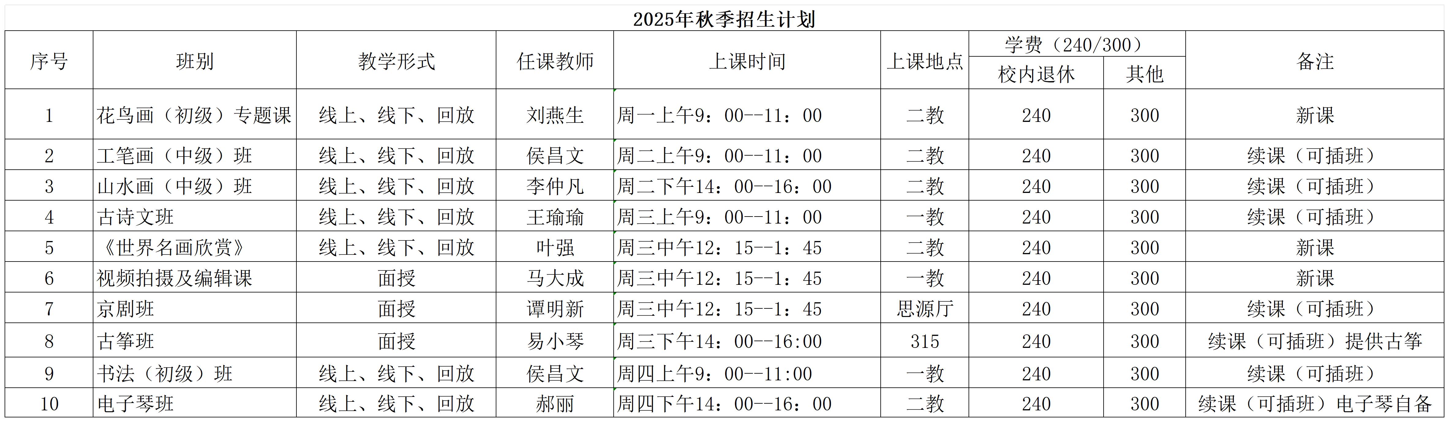 风清月朗,硕果盈枝,又是一年好景,北航老年大学倾情推出秋季学期精品课程10门,涵盖文化修养、艺术鉴赏等多元领域。课堂将开展丰富多彩的学习活动,助力老师们在秋日收获知识、陶冶情操、乐享生活。