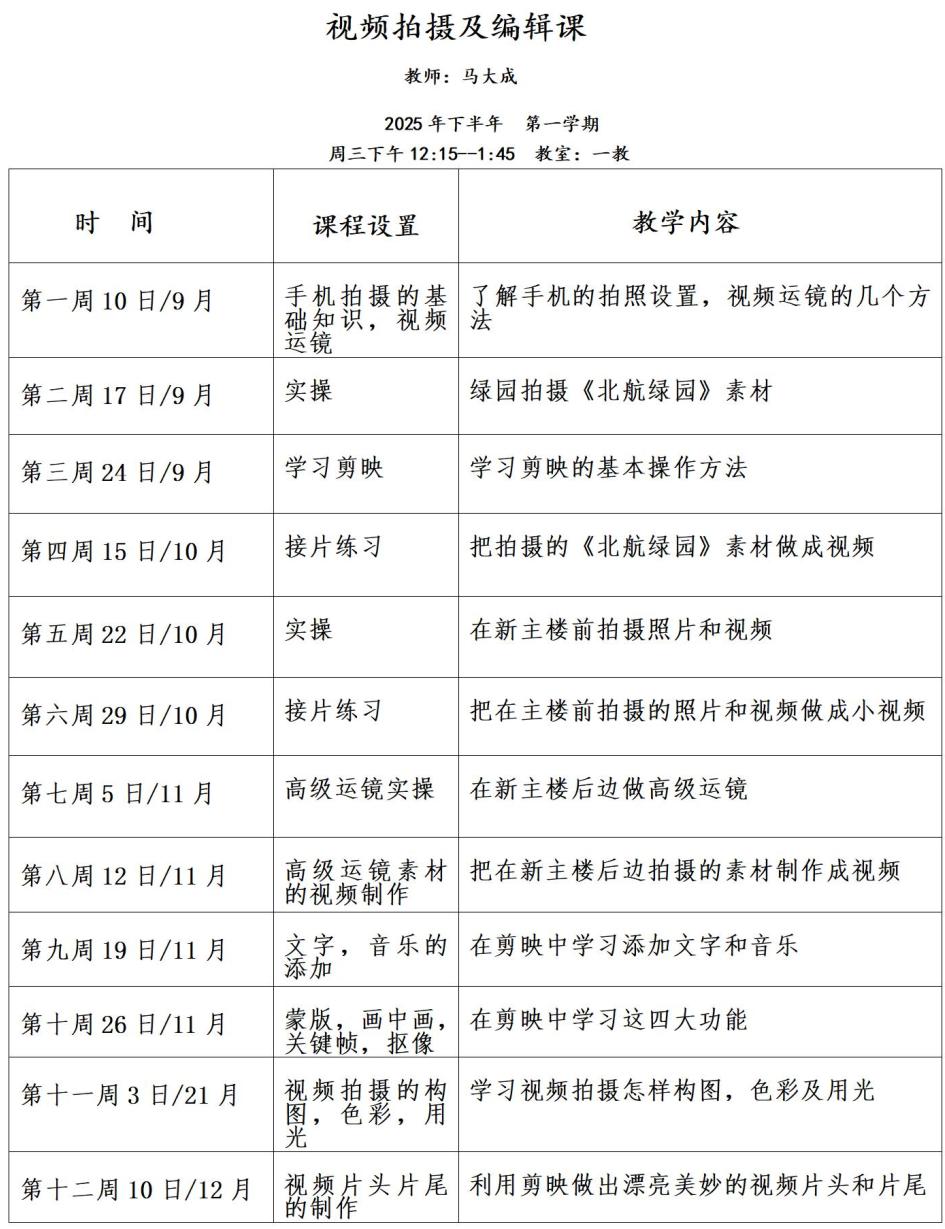 本课程以手机短视频创作为核心,系统讲解拍摄技巧与剪辑方法,帮助学员快速掌握从拍摄到成片的完整流程。从基础运镜到高级构图,结合北航校园实景练习,学习光线运用、色彩把控及镜头语言表达,提升画面质感。 通过此次课程的学习可以提高拍摄视频和拍摄照片的水平,同时也学会编辑本方法,可以制作出高于一般人的优美漂亮的视频,轻松记录校园生活与美好瞬间。