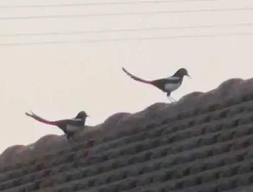 喜鹊时而在屋顶上双双相聚