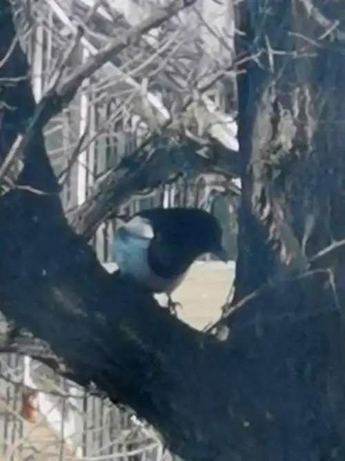 喜鹊在我家窗前树杈上觅食