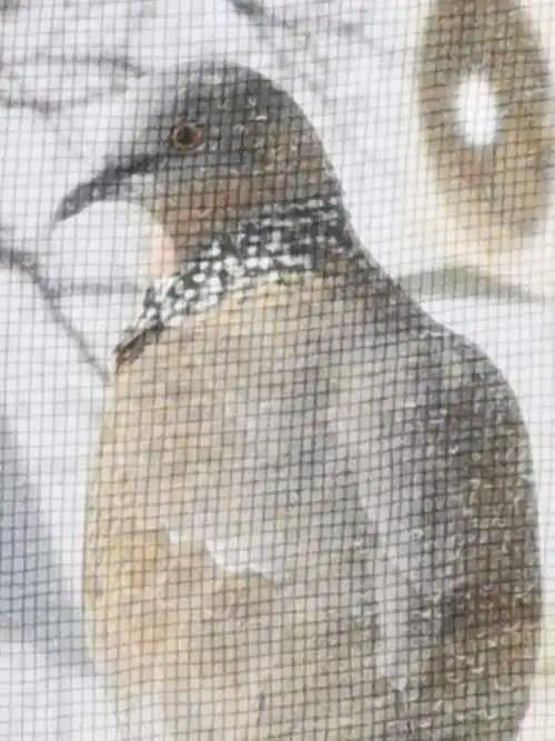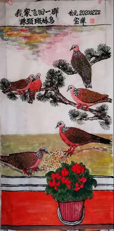 高兴之余,我创作了一幅《我家飞回一群珠颈斑鸠鸟》的画作。