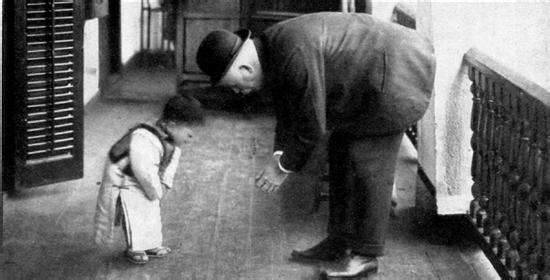 这一刻:人间的善良,纯真,大爱,美好立即充满了我的整个身躯,在身体里激起了澎拜的波涛。眼睛模糊了,这是因为感动!感动这个刚刚踏入人世才3年的幼小生命,在自己得到医护人员的精心救治后,本能驱使他用这种最原始,最真诚的方式表达自己的感激之情,感恩之心。而我们的白衣天使,却毫无居高临下的做作之态,把甘于奉献的善良内心表现得淋漓尽致!人间多美好啊!人性多善良啊!这是人间大爱的美好画卷!是根植于人类内心深处的,与生俱来的本性。所谓“人不为己,天诛地灭”的西方哲学谎言,在这里不攻自破了。还是中国古代圣贤孟子的“人之初,性本善”的哲学观点,才能真正诠释芸芸众生的人性本质。其实,人间的这种大爱与善良,是既不分古今,也不分种族的。君不见,下面这张一百多年前的老照片,是当年一个被救治后的中国小患者向英国医生梅滕更鞠躬的照片。你看,它与今天武汉“抗疫”期间的那张照片是何等的相似!不仅形似,更可贵的是神似!你看这一老一小,你看这双方的一躬到地,你看他们俩人的一脸凝重,谁看了不感动,谁看了不思绪万千?