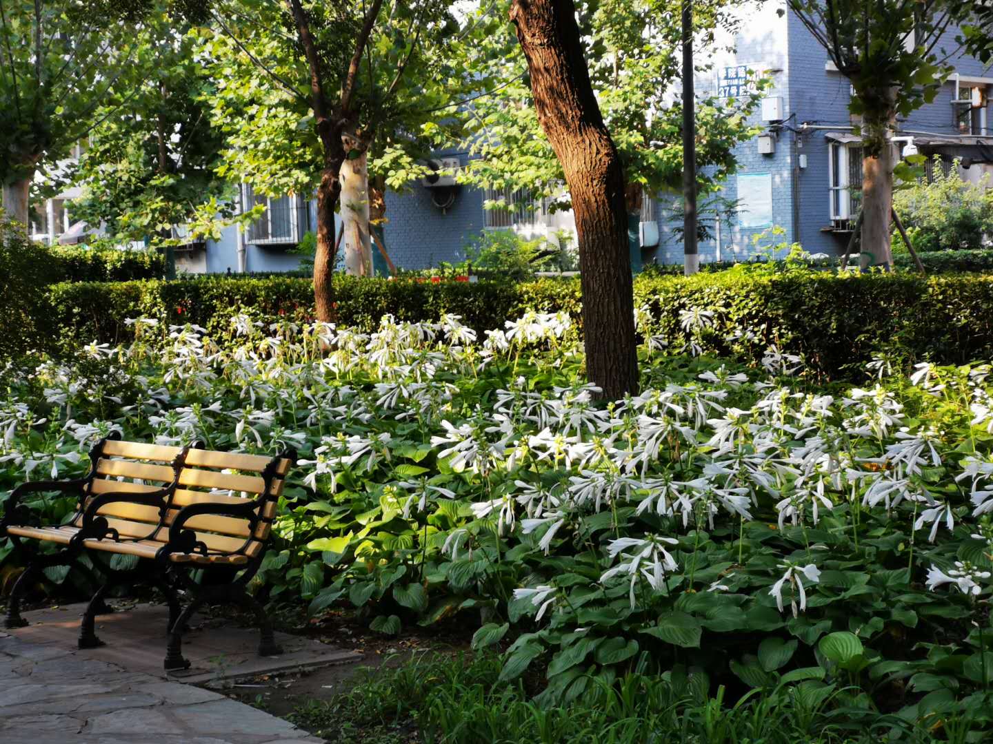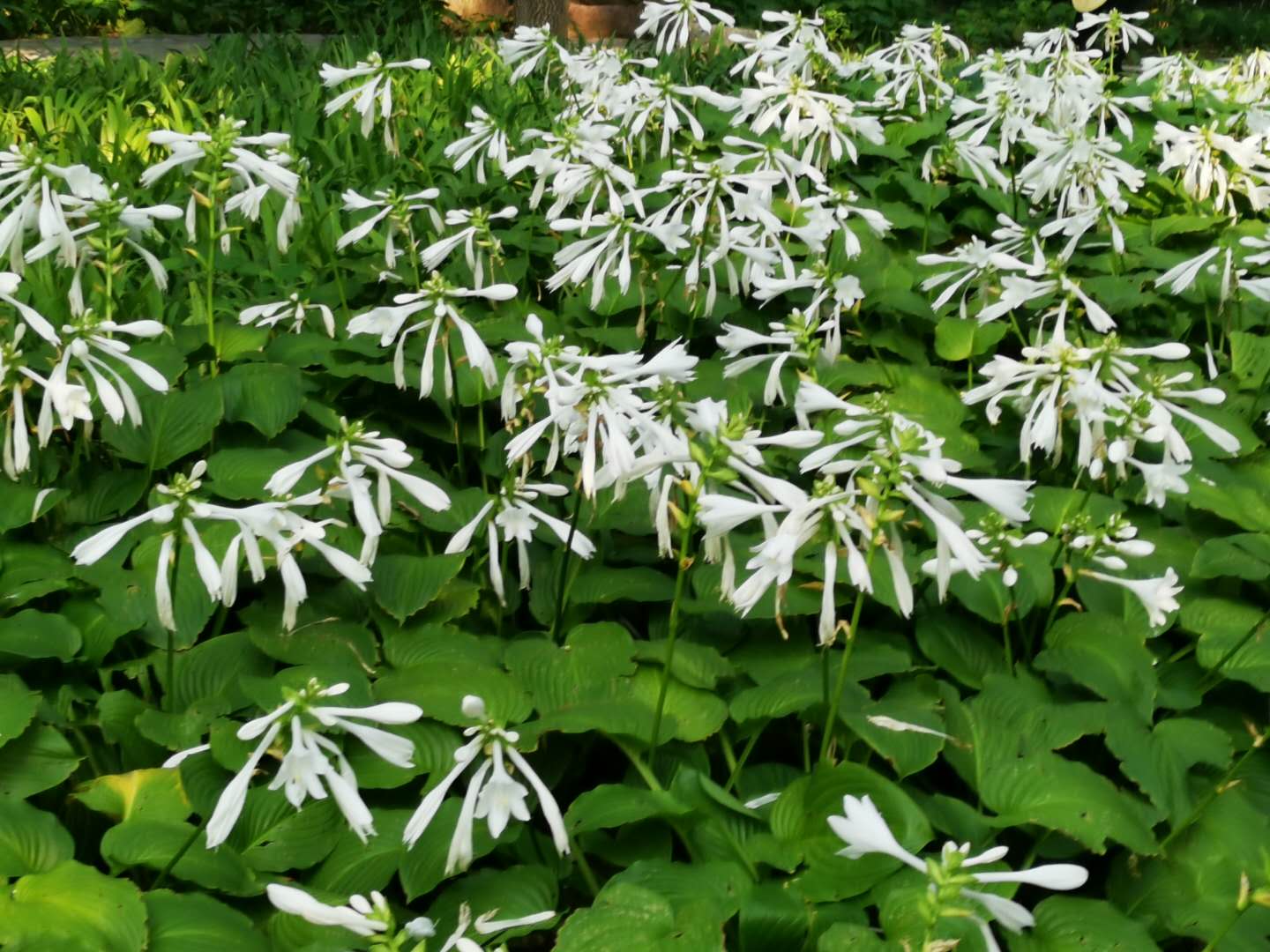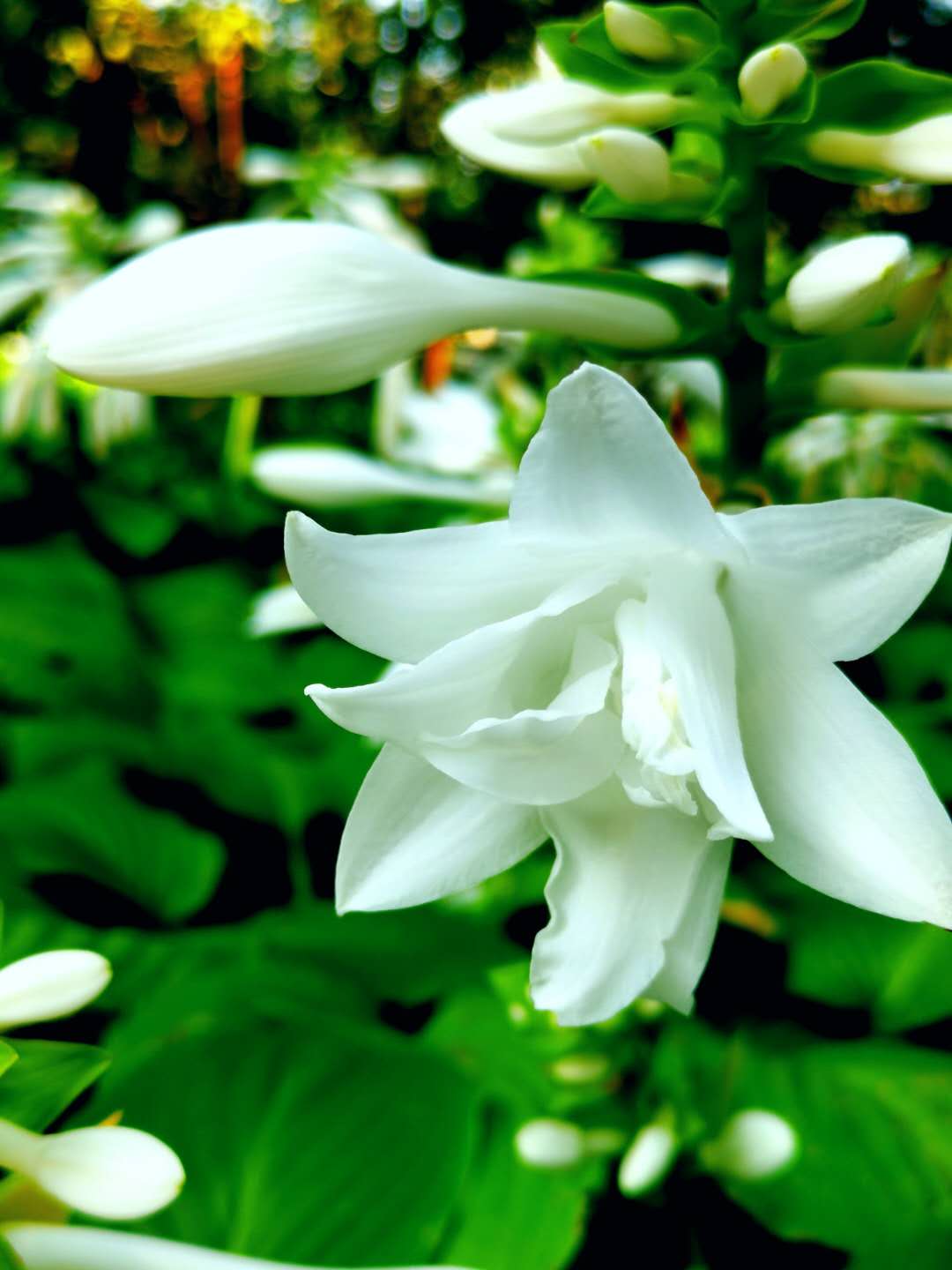清晨六时,我准时起床。推窗见翠绿,开门进公园。我来到了大绿园西南园区,映入我眼帘的是大片的玉簪花海。行至玉簪花海处,欣闻花香飘来时,现在正值观赏玉簪花的最佳时机。我独自一人,轻步徐行,徜徉在玉簪花海宁静的小径上。处暑的初阳,不热不燥,穿过密林,一束束光线照射进来,撒满花海;一阵阵清香飘荡而来,弥散而去。此时的我,呼吸着绿园的清新空气,精神抖擞;闻着玉簪花的香气,心旷神怡!