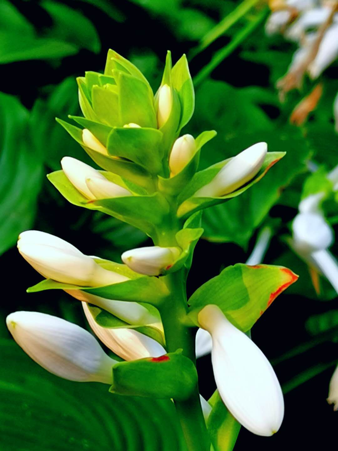 漫步在花海中的我,不由自主地打开手机,蹲下去,弓着腰,在花海中寻觅着我想要拍的花朵。在花海中我仔细地观察各种不同的花朵形状:有的刚形成的小花苞,像黄豆大小,上下似塔形排列着;有的花苞已经长大长长,雪白雪白的,横向支出显现,一头大一头小,一目了然,极像古代妇女头上的装饰品玉簪,故称为“玉簪花”;有的花朵完全开放,洁白的花瓣组成喇叭状的花朵,谈黄色的小花蕊缩在花朵内,一点也不张扬,花朵内不断地溢出清纯的香气,使人陶醉。花朵一经选定之后,我就好似跟它对话一般:你别动,我给你拍照。一阵微风吹来,花朵摇曳不止,我会马上停止拍摄,稍停片刻,一旦风欲止,我会马上按下快门。有时我也会站着眺望花海,择机拍摄花海中难忘的画面。一眼望去,白色的玉簪花连成片,洁白如玉,在翠绿的花叶衬托下,显得更加高雅、洁白、清纯。在这白色的花海中,还有紫色的沿阶草花和绿色的草坪,紧紧地连结在一起。大自然像一块调色板,把洁白的、淡紫的、绿色的各种颜色调和在一起,天然自成了一幅绚烂多彩的图画,供我们欣赏、享受!此时此刻的我,又被陶醉了。于是,我一次又一次地按下手机的快门。