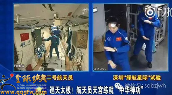 报道中说,2016年神舟十一号飞船与天宫二号空间实验室成功实施分离,航天员景海鹏、陈冬当天演练了这一“巡天太极”,与此同时仝飞舟也在深圳“绿航星际”实验舱同步进行。证明在狭小的空间环境下对航天员的心理和生理都能得到明显的改善。在太空舱里,虽然处于失重状态下,但见他们刚柔相济,内外兼修,如行云流水般的太极运动。是真正的天人合一,也是中国航天史上又一个里程碑式的大事。