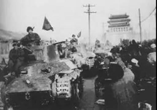 一直等到临近中午了,渐渐一辆辆的坦克,轰隆隆由远处而来,我们大家立刻欢呼了起来,每人手举着小小的三角彩色旗,挥舞着高喊口号,面对一辆辆坦克车,欢呼声一阵阵经久不息,我们都很激动。这场面一直持续到下午。