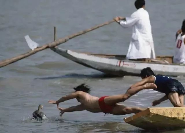 四川乐山,端午节岷江上的龙舟赛,选手扑向水中捉鸭子