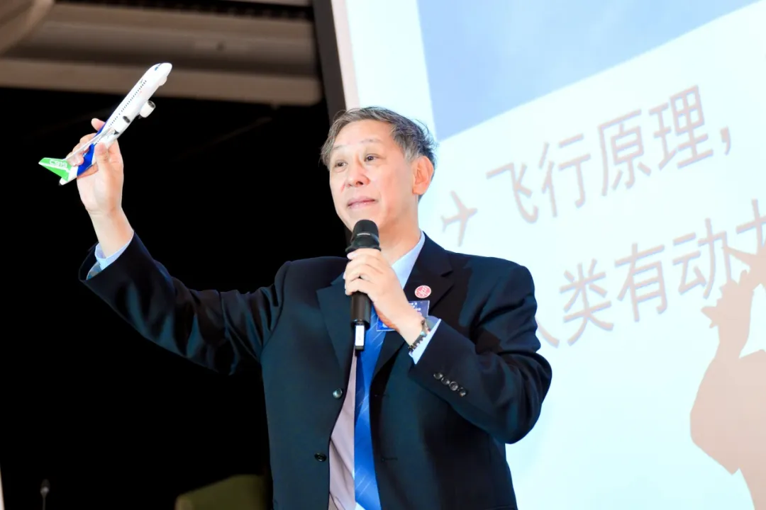 陈志英以“脚踏风火轮去飞翔”为题,利用“风火轮”的贴切比喻,结合同学们的基础知识,讲解飞机升力原理、飞行器的飞行特征等,寄语同学们“仰望星空志高远,脚踏实地向未来”。