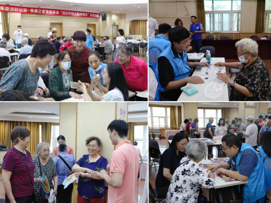 泰康溢彩公益基金会的工作人员现场展示了“健脑包”的组成部分,在活动现场的体验市集上,老同志们在志愿者的带领引导下,积极参加“认知评估测一测”、“健康知识知多少”、“记忆之王大挑战”、“12周脑训练计划一起来”、“舒筋活络球多妙用”等游戏。