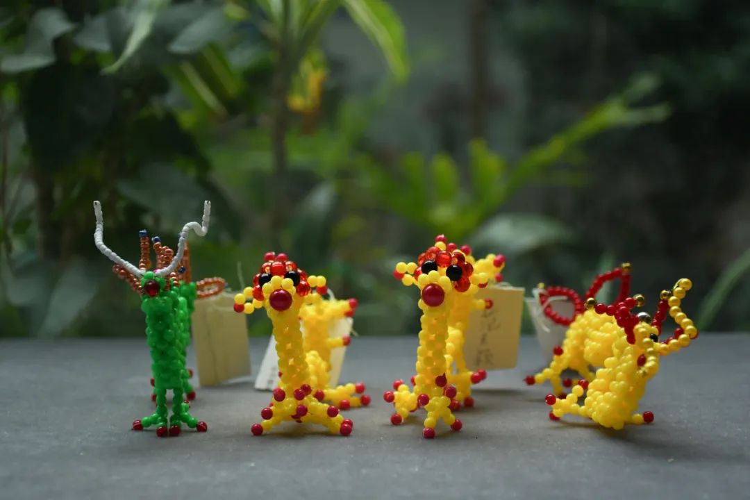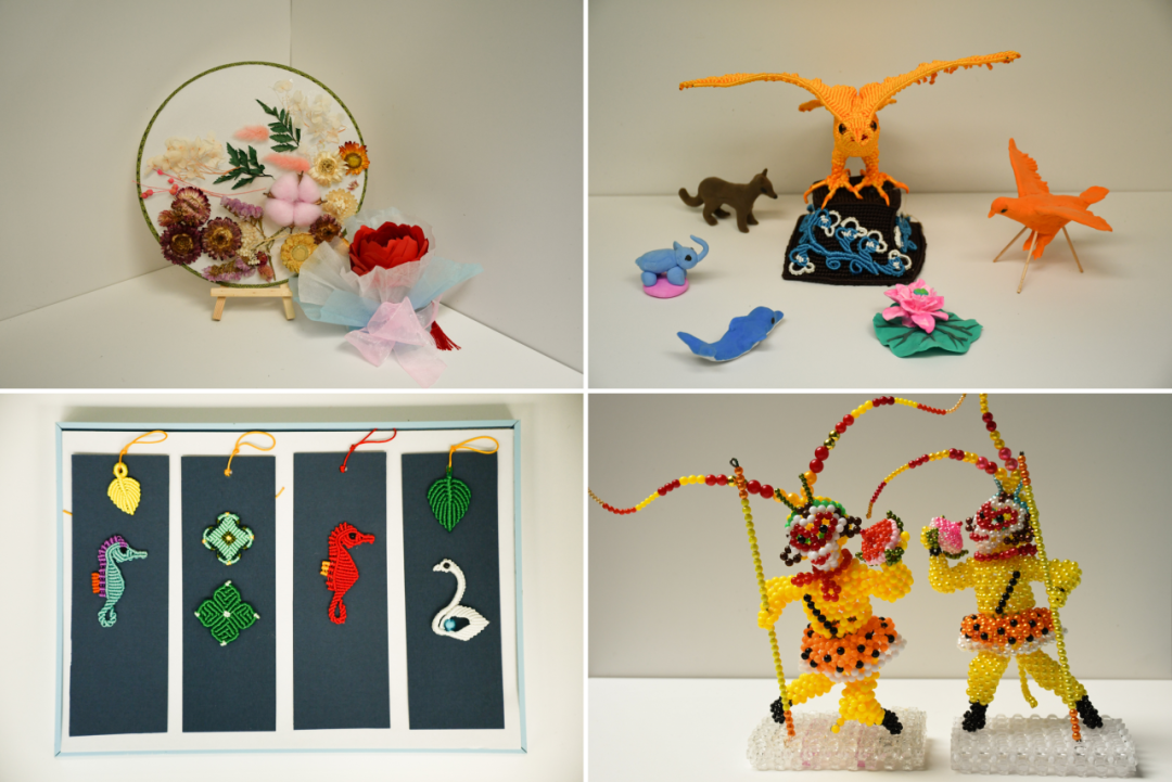 钩编、珠编、绳编,有盆栽小花,也有傲雪寒梅,有狗兔狐鸟,也有展翅雄鹰,有帽子背包,也有簪缨配饰。巧手巧思,惟妙惟肖,琳琅满目,精彩纷呈。
