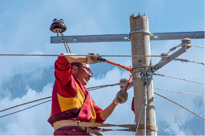 这张照片是《建设家园》,拍摄于西藏自治区。当时我看到,一位西藏青年正在修理电路,在蓝色天空的映衬下,他红色的衣服十分耀眼。他的双臂充满力量,张开的钳子形成框架,露出的脸被太阳照出光线,仔细看,他的脸上充满笑容,十分感染人。他让我感到人民建设家园的幸福感和对美好生活的向往。