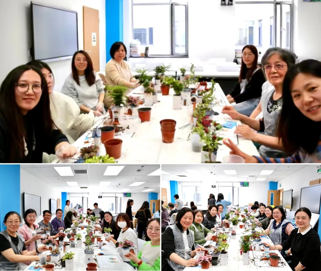 在老师们的热情参与下,活动正式开始。各位教职工挑选心仪的绿植和微缩景观材料,并结合徽派建筑元素,构思微景观布局。大家一边探讨设计心得,一边感受春天的生机与手工制作的乐趣,活动现场气氛融洽,欢声笑语不断。