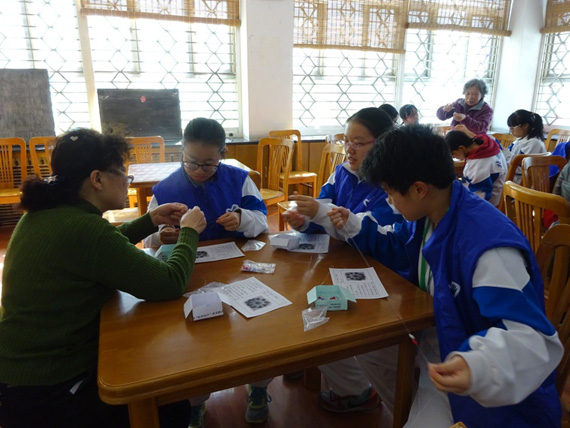 同学们从未接触过这种手工活动,他们充满着好奇和新鲜感,他们学得特别认真,老师们教的也特别仔细。一个多小时很快就过去了,有的同学完成了两个作品,有的完成了一个作品。同学们拿着自己刚刚完成的作品,打着胜利的手势,在他们脸上露出一份收获后的喜悦心情。