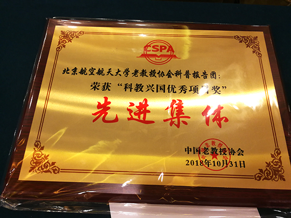 会议通过并宣布了2018年对先进集体和先进个人的表彰,表彰的先进集体有11个,先进个人15名。北航老教授协会科普报告团被评为科教兴国优秀项目奖先进集体。