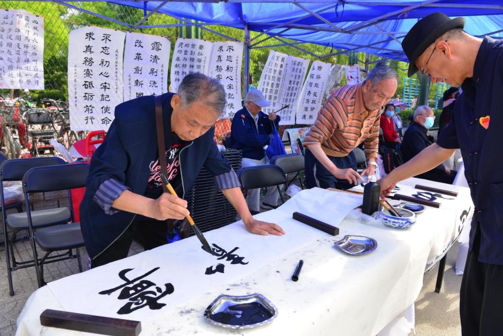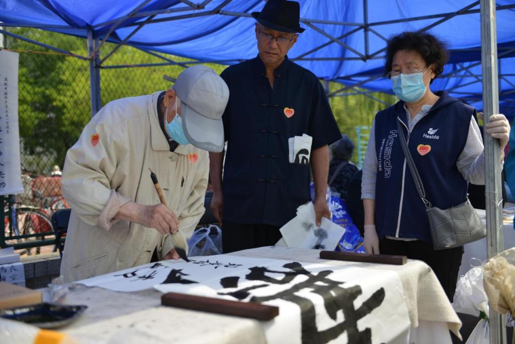 在运动场北侧帐篷内,北航老年书画研究会的老同志们挥毫泼墨,现场书写书法作品赠送给大家。