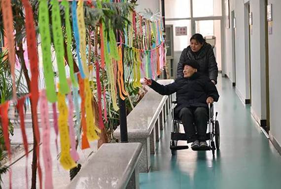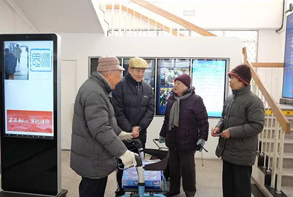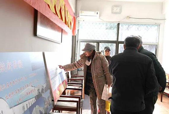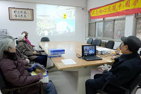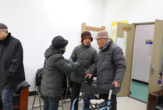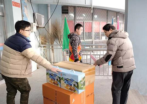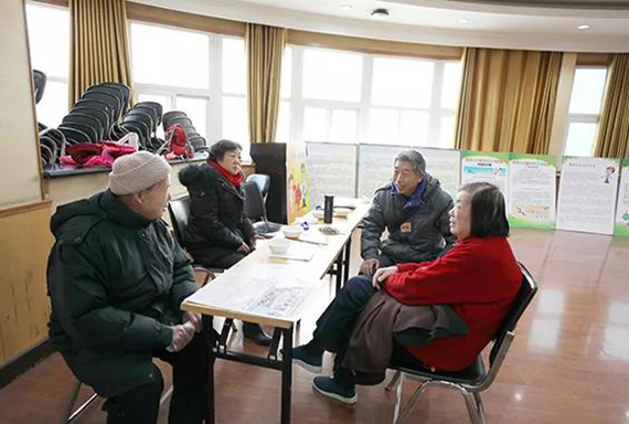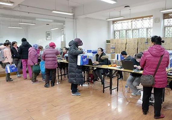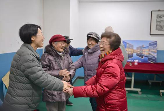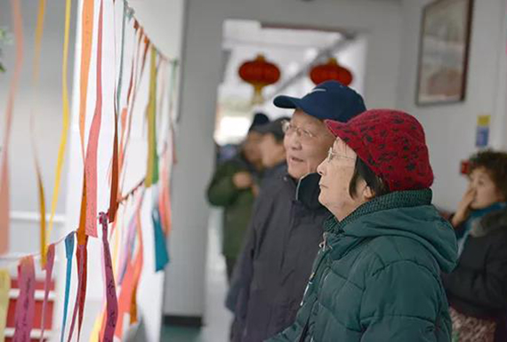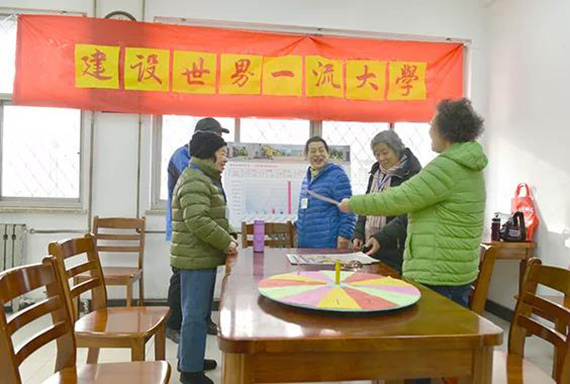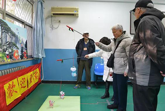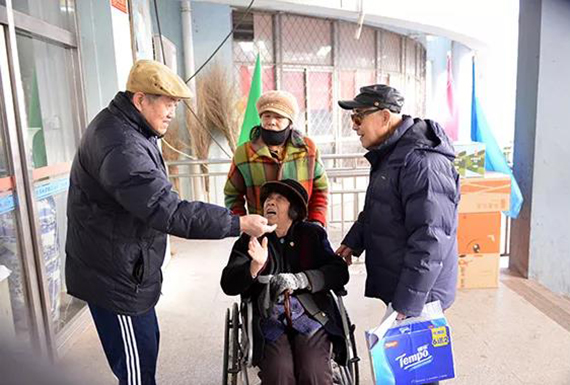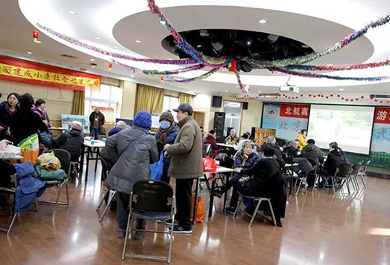 志愿者为老同服务发放游艺会礼品